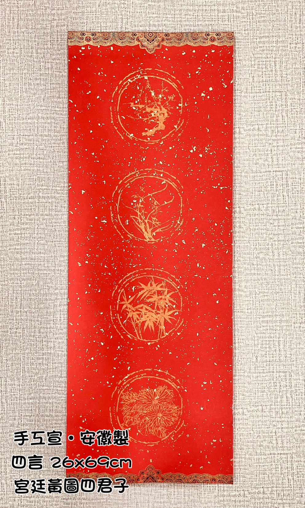 《四言 瓦當灑金紅宣 宮廷黃圖四君子》 26x69cm