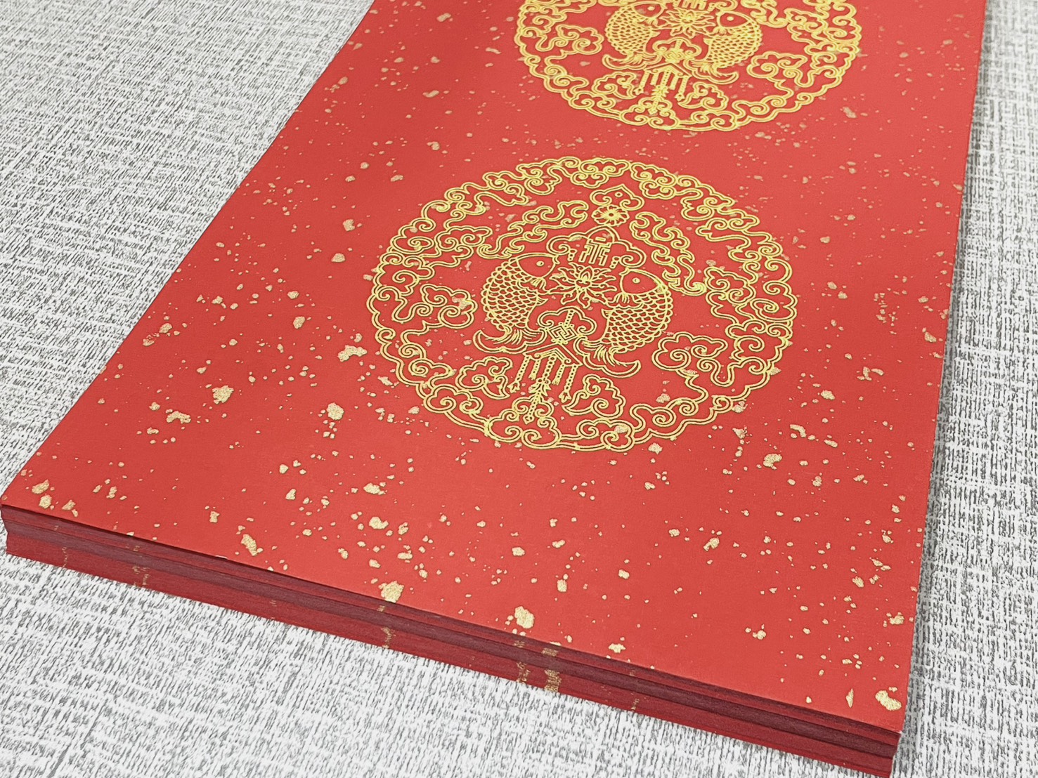 《窄四言 瓦當灑金紅宣 黃圖雙魚》 23x69cm